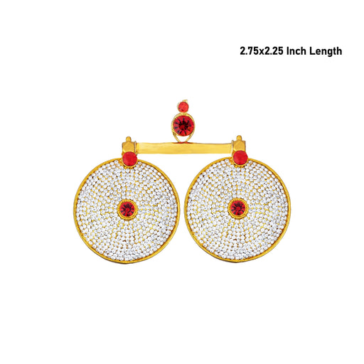 This is a decorative face of Goddess Lakshmi, beautifully made with ornaments, a crown, and colorful features. It is placed on the kalash (a sacred pot) and represents the goddess herself during the pooja. Worshipping this form brings divine blessings into the home