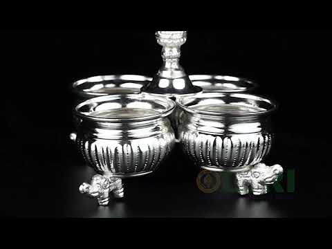 • The 4 Cup With elephant leg base made up of white metal called as panchwala or haldi kumkum holder with peacock handle, Best for daily use and special occasions and it is made from Pure stainless steel which is highly finished, and durable and comes with anti tarnish finish which makes them maintenance free.
