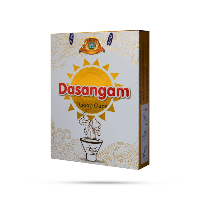 Chamundeshwari Dasangam Dhoop Cups are traditional Sambrani (Guggal) cups made from a sacred blend of aromatic herbs, resins, and natural ingredients. These dhoop cups are widely used in temples, homes, and spiritual spaces for their ability to purify the environment and invoke divine vibrations. The term "Dasangam" refers to a combination of ten sacred ingredients, making it highly potent in spiritual and ayurvedic traditions.