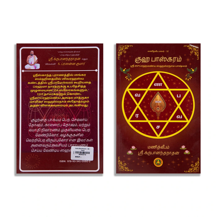 Sri Krupananda's Tamil book is titled Guha Bhaskaram. The thorough spiritual and scriptural study ""Nathan"" provides a thorough explanation of the Sri Subramanya Sahasranama, which are the thousand holy names of Lord Murugan. This Tamil classic, which is revered as both a mantra book and a shloka book, is based on profound devotion, spiritual understanding, and the rich history of Hindu religious literature. By fusing mythology, sacred sound, and scriptural knowledge, it takes readers along the bright road of Muruga bhakti.