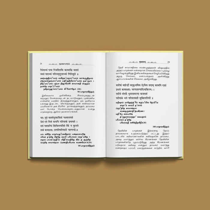 • Mukasaram - Sanskrit - Tamil is not merely a devotional book/spiritual book; it is a sacred key that unlocks the gates of divine consciousness. It is a companion for spiritual seekers, a guide for devotees, and a testament to the enduring power of devotion. Embark on this sacred journey and experience the transformative power of Mukasaram as you immerse yourself in the boundless grace of Goddess Kamakshi.
